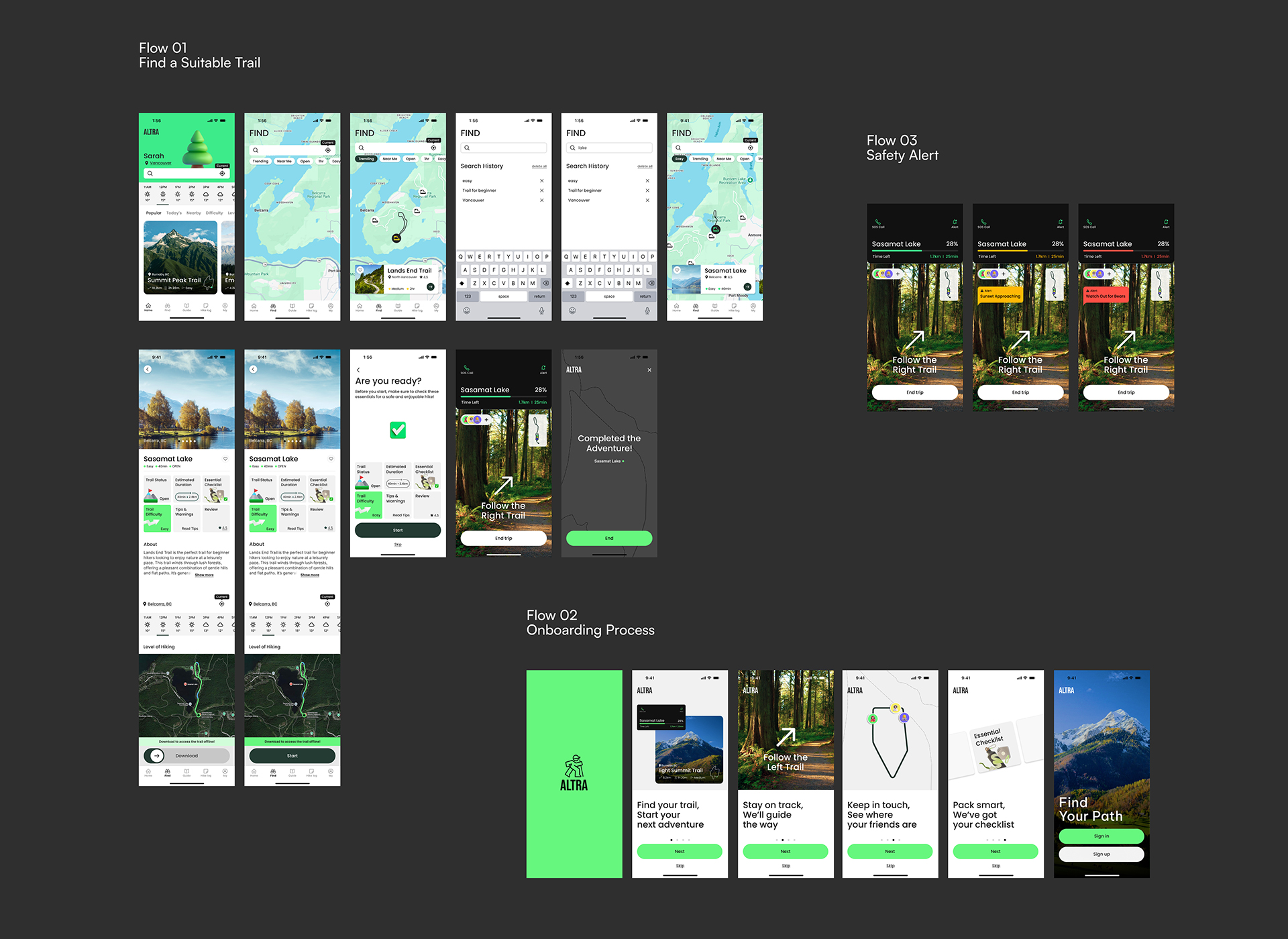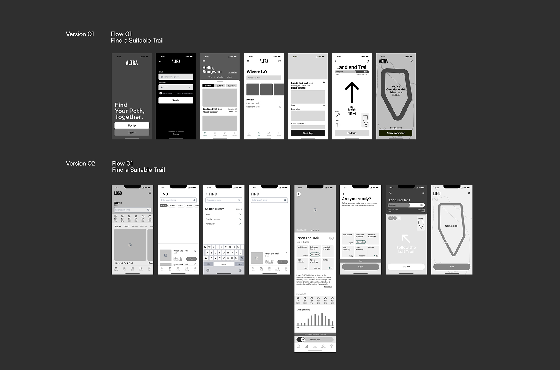 The first wireframe outlined the full hiking journey from discovery to completion. However, overlapping screens created redundant steps and higher cognitive load.