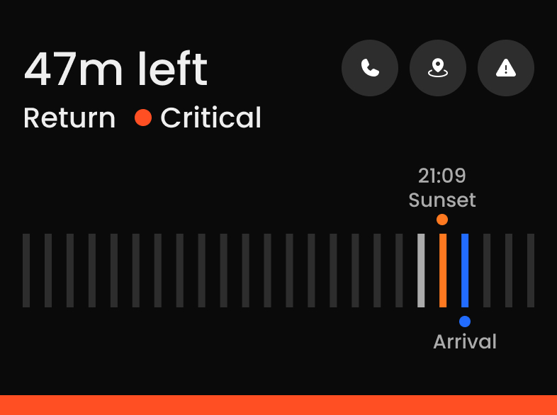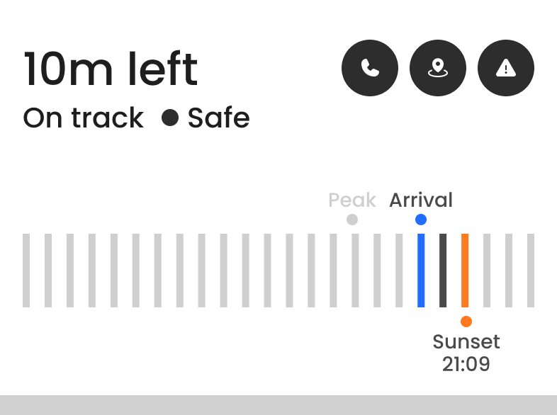 Distance, ETA, and daylight are not presented as isolated data points. They are translated into visible safety states that reduce interpretation at the moment of decision.
