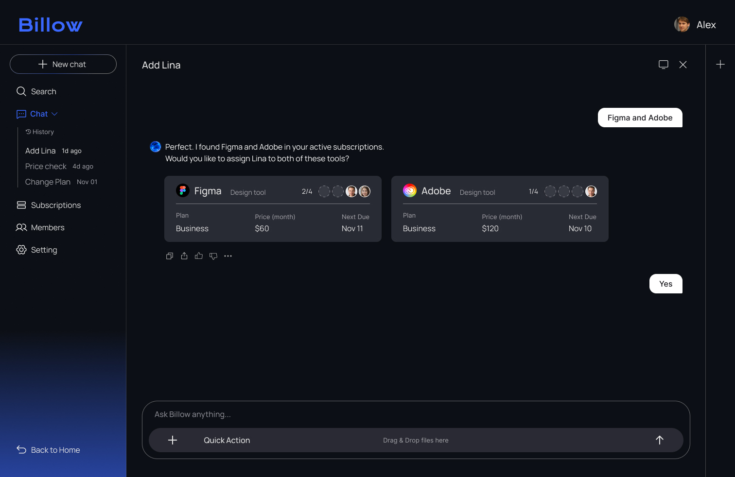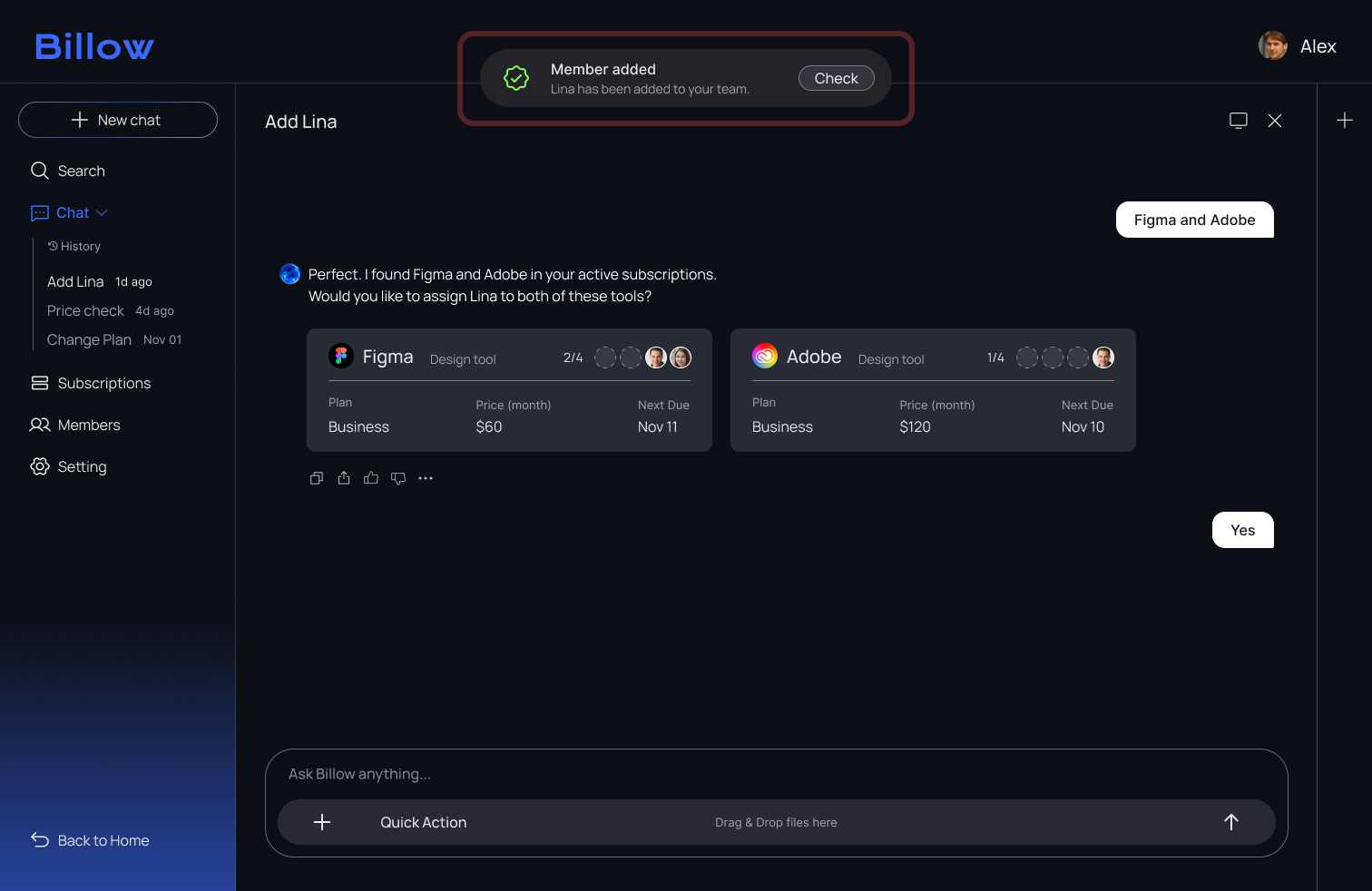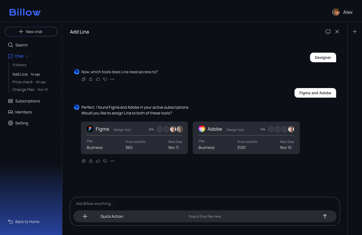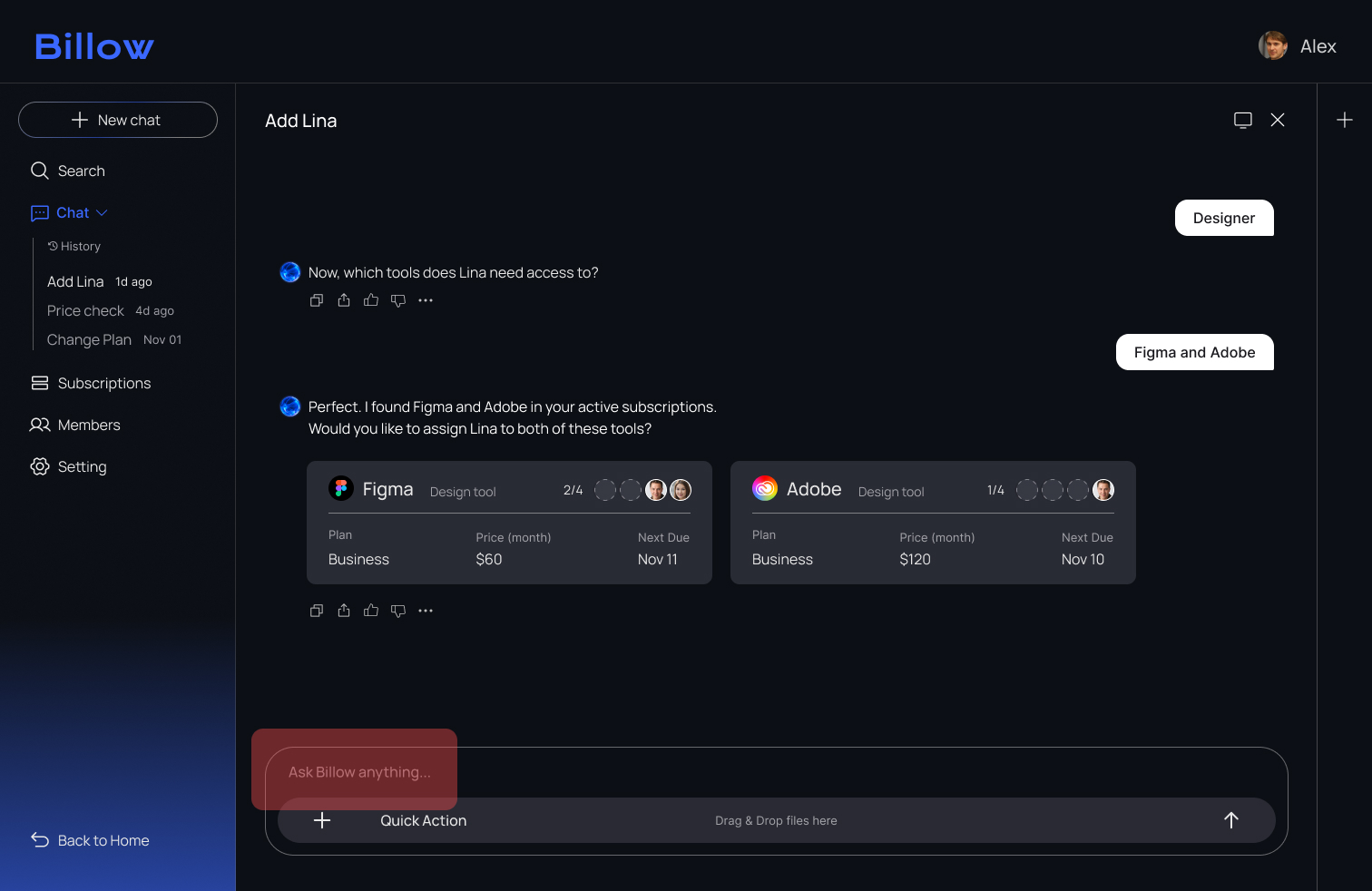 opens Billow and registers Lina through the chat. With AI guiding the flow, he assigns the tools she needs in just a few clicks.